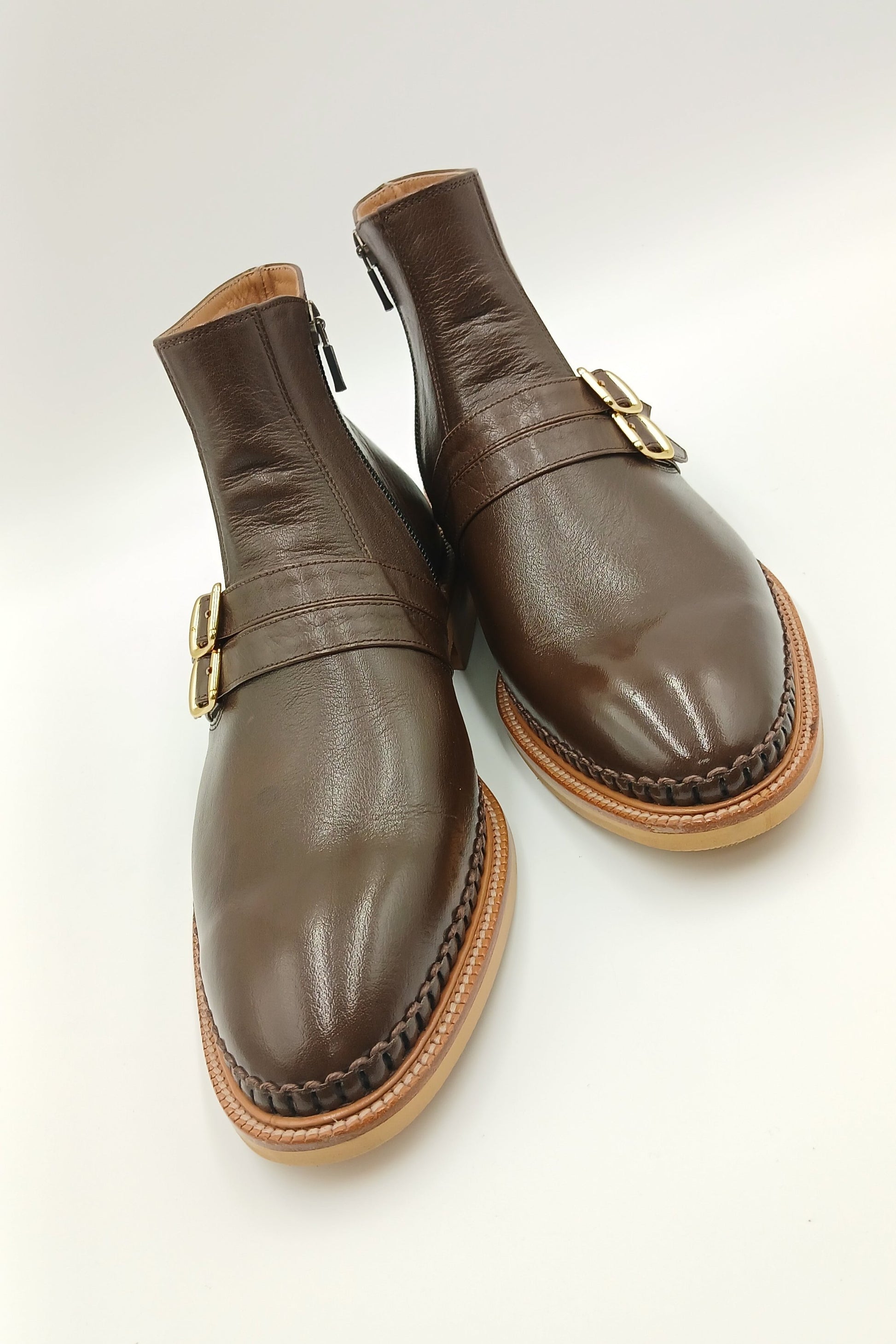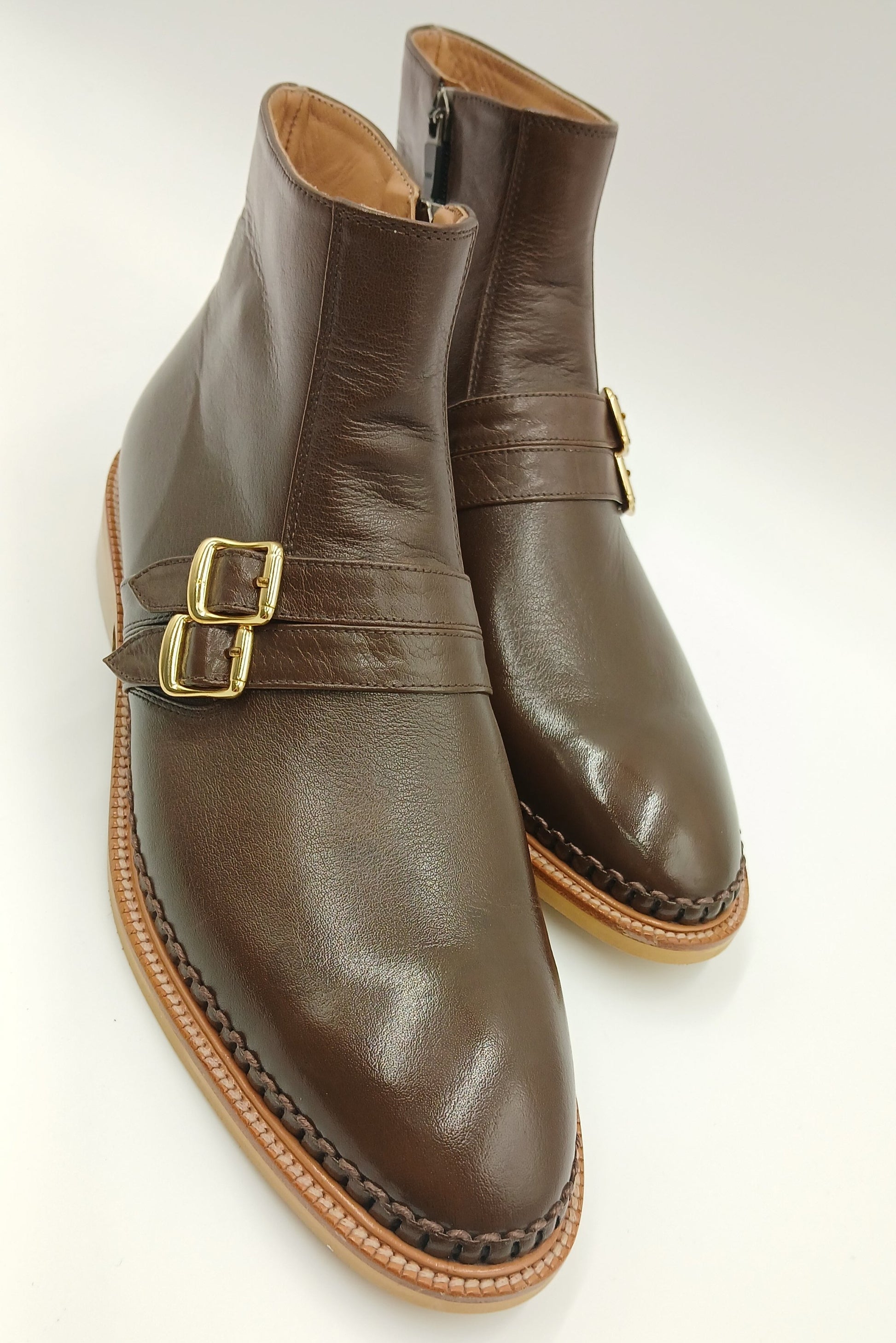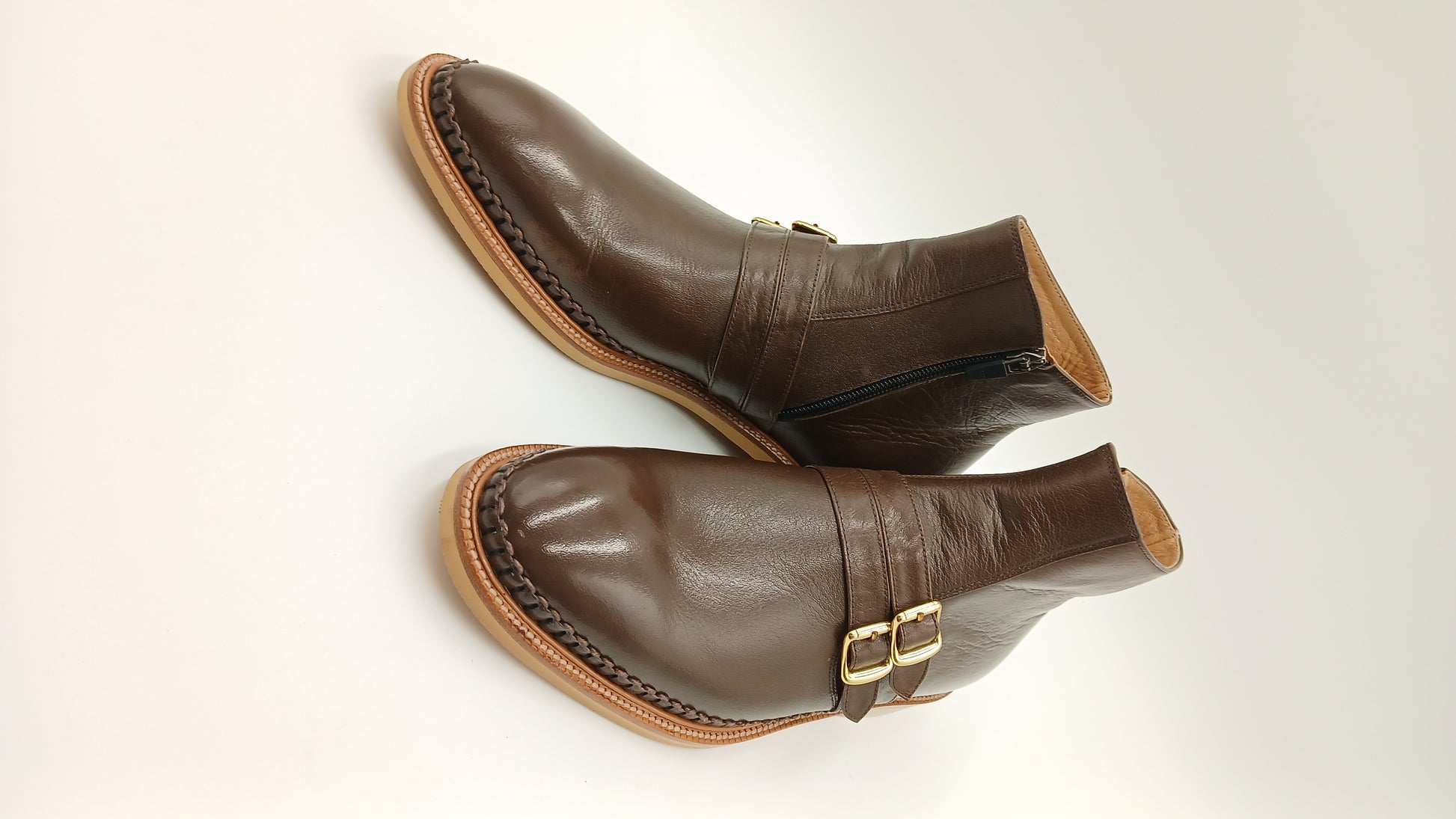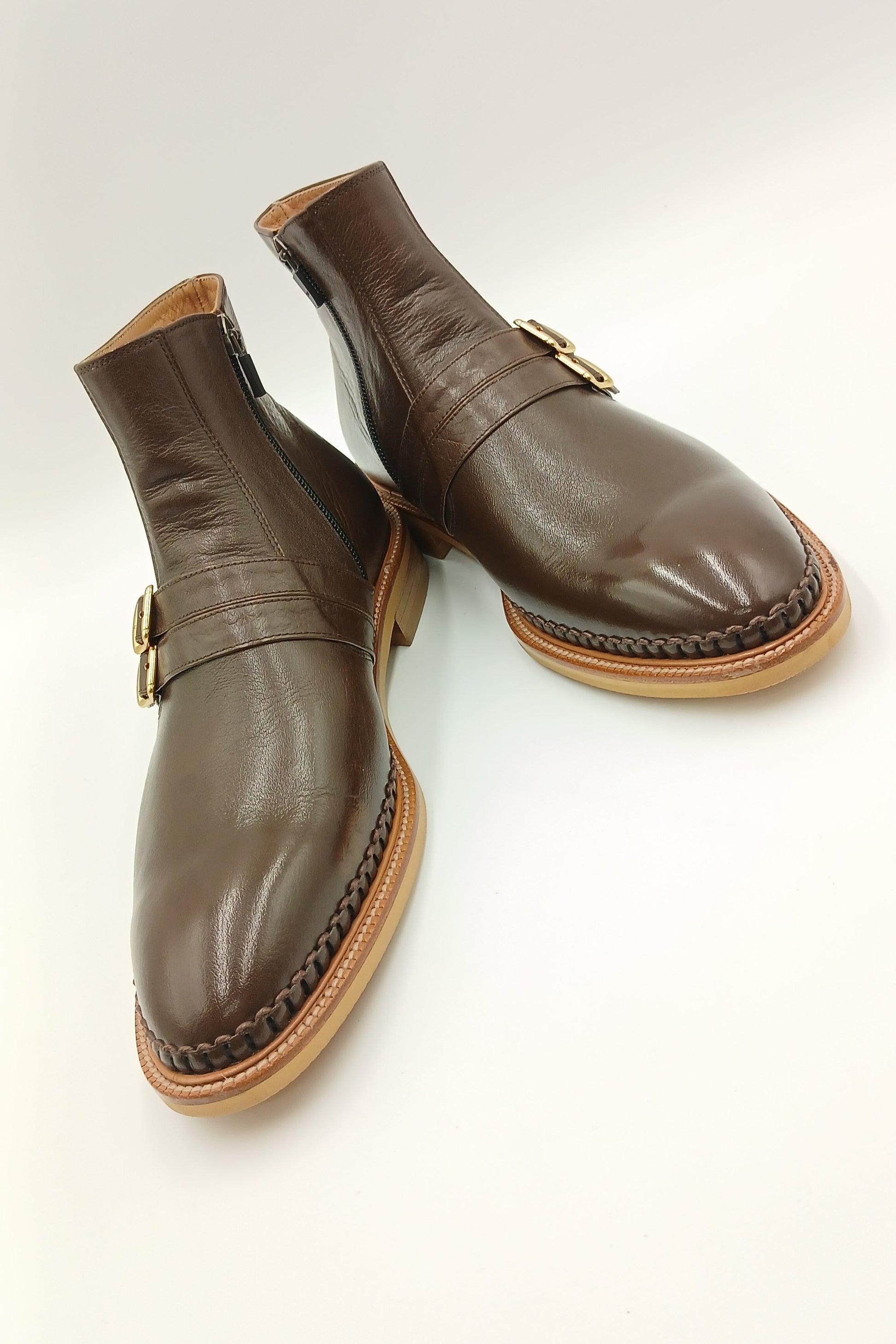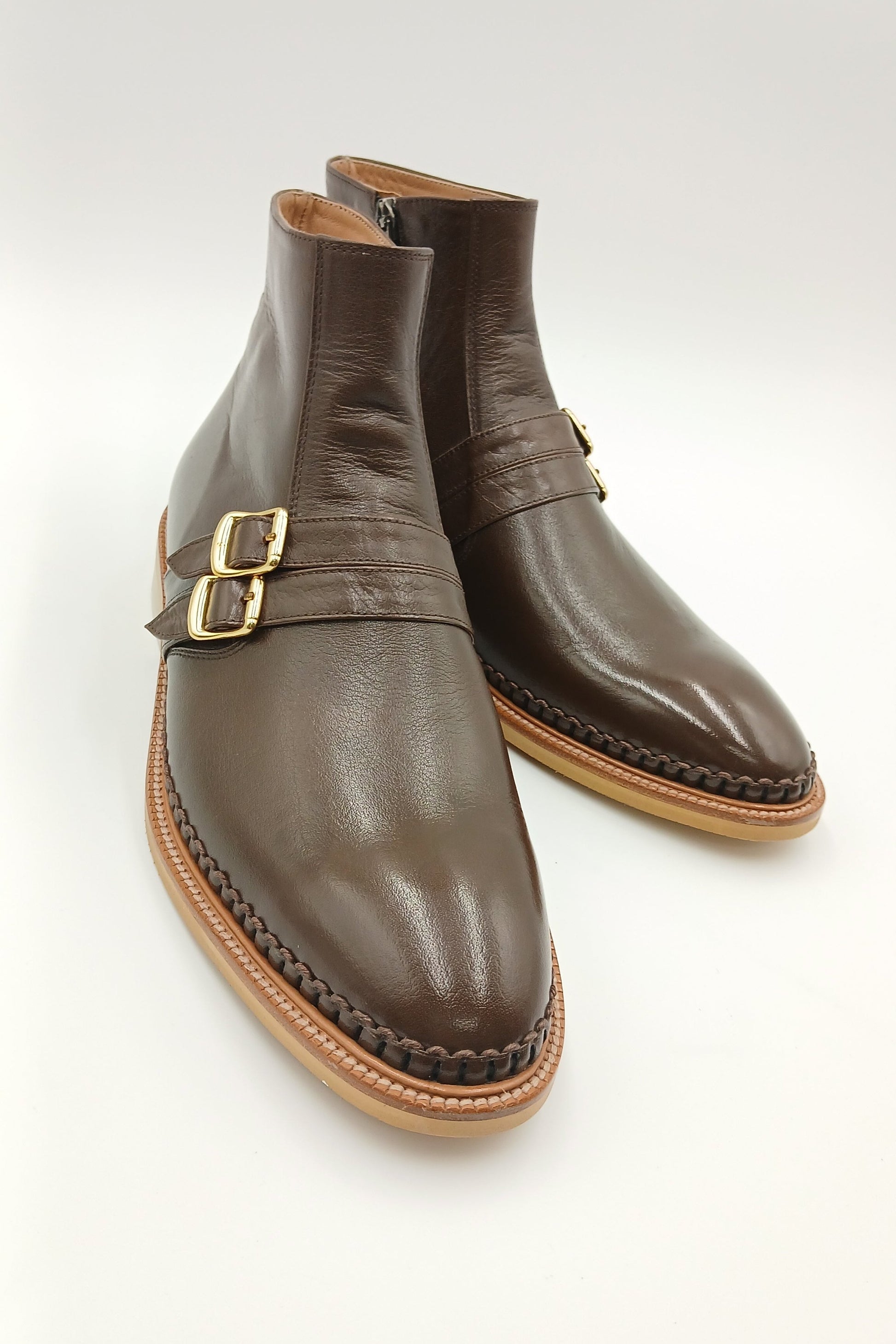 The Saddle Crest Boots blend timeless elegance with functional design, featuring a rich brown leather upper, dual gold-tone buckles, and artisanal hand-stitched detailing. These boots are a versatile statement of sophistication, perfect for formal and smart-casual occasions.