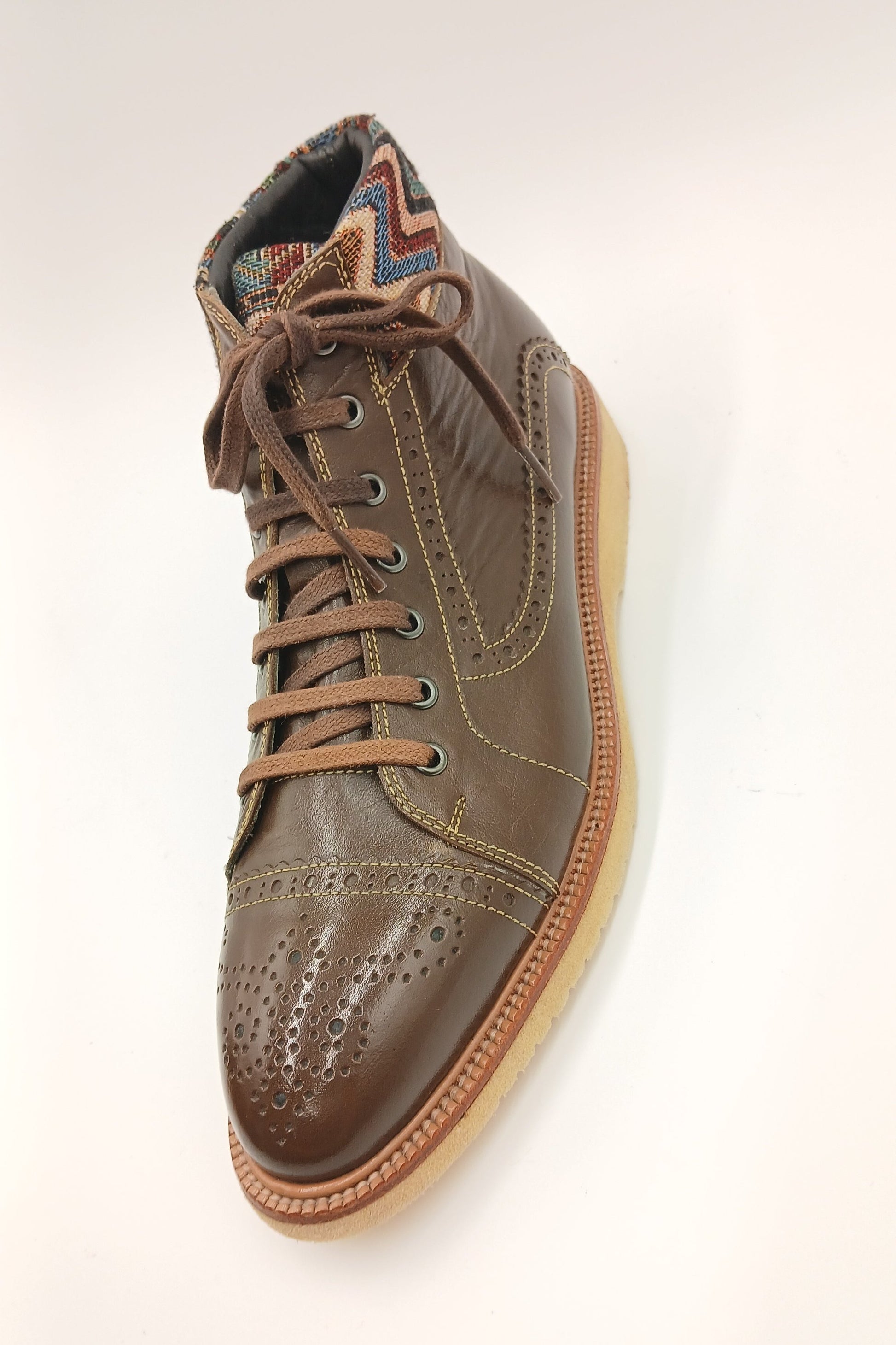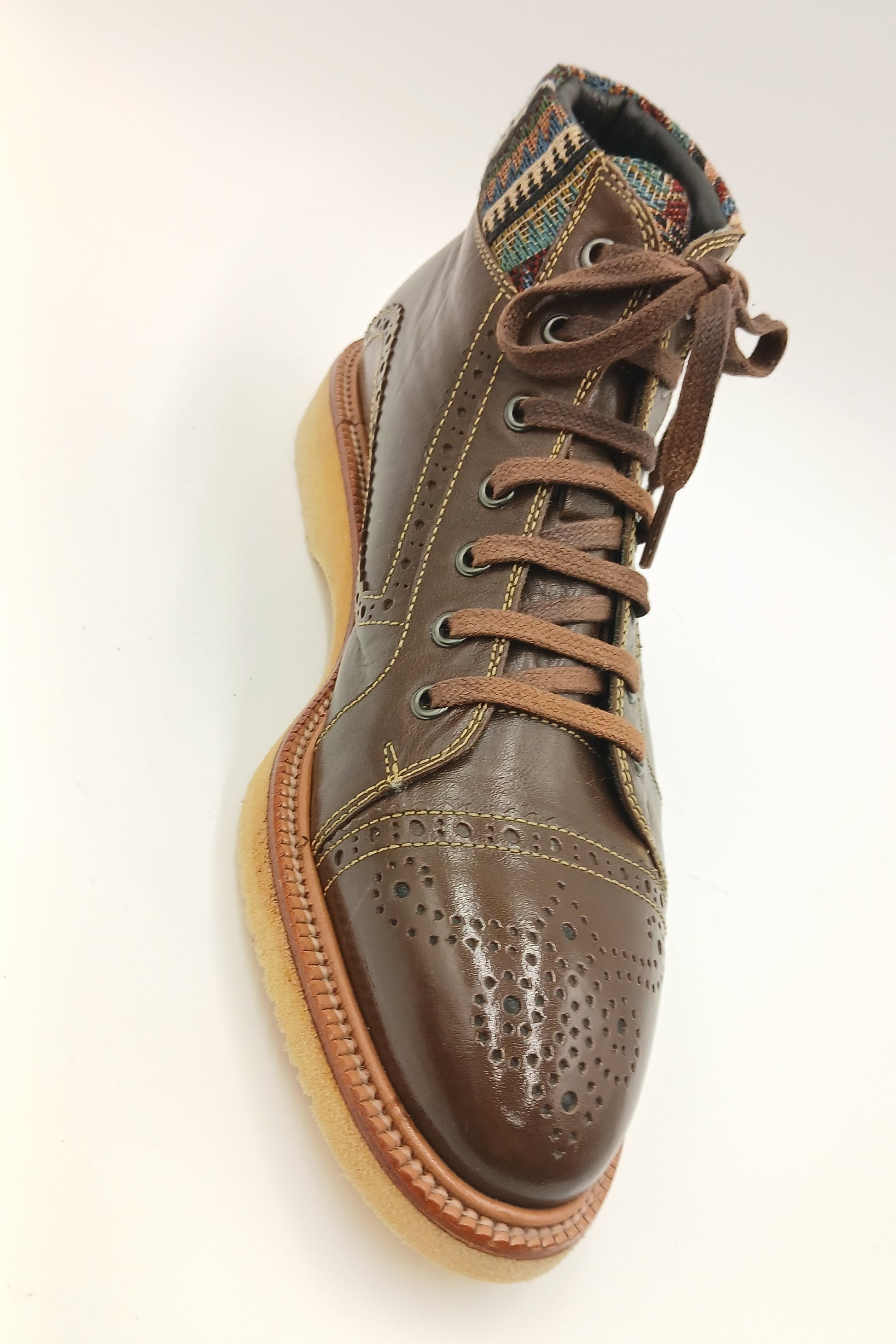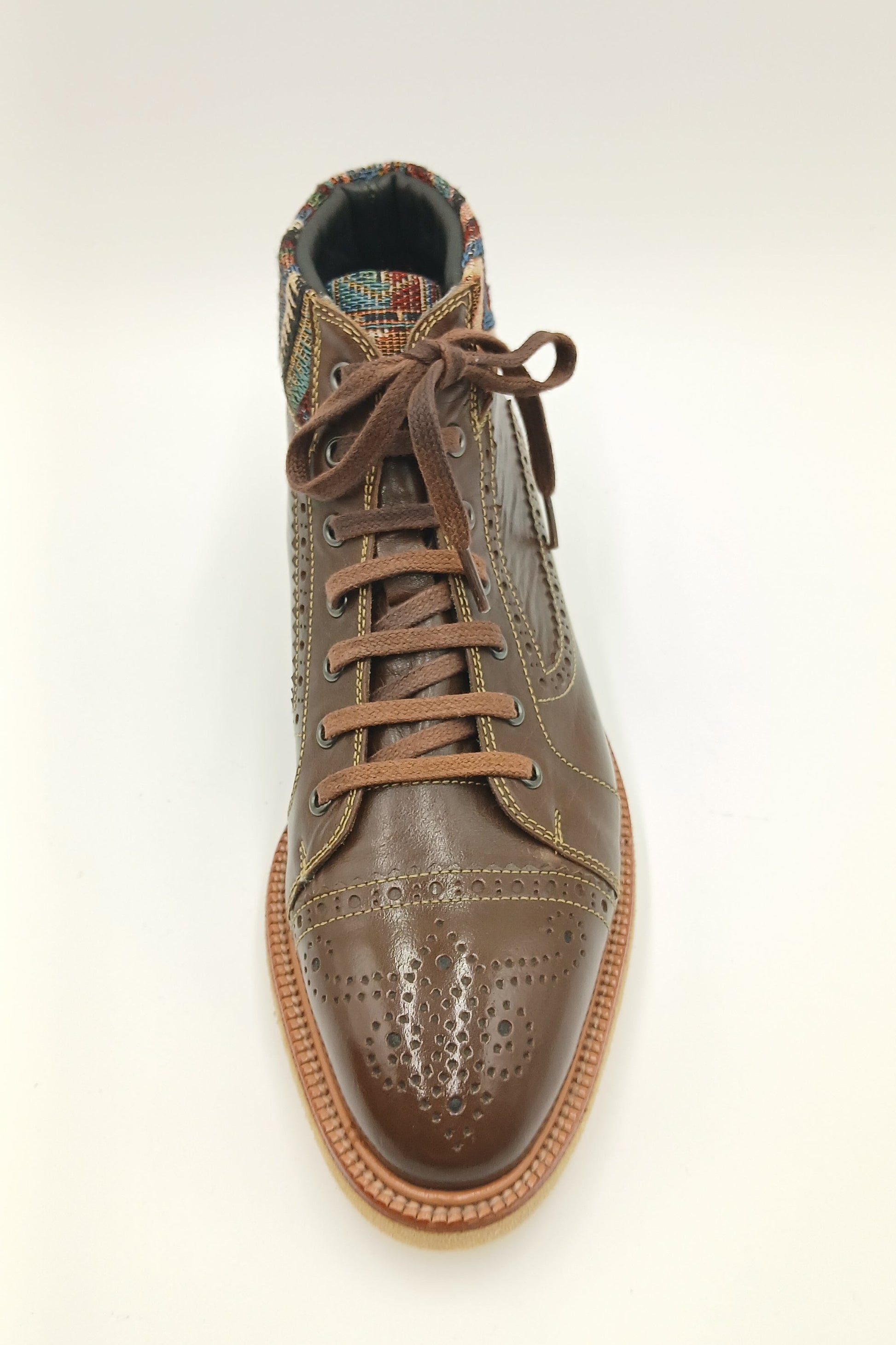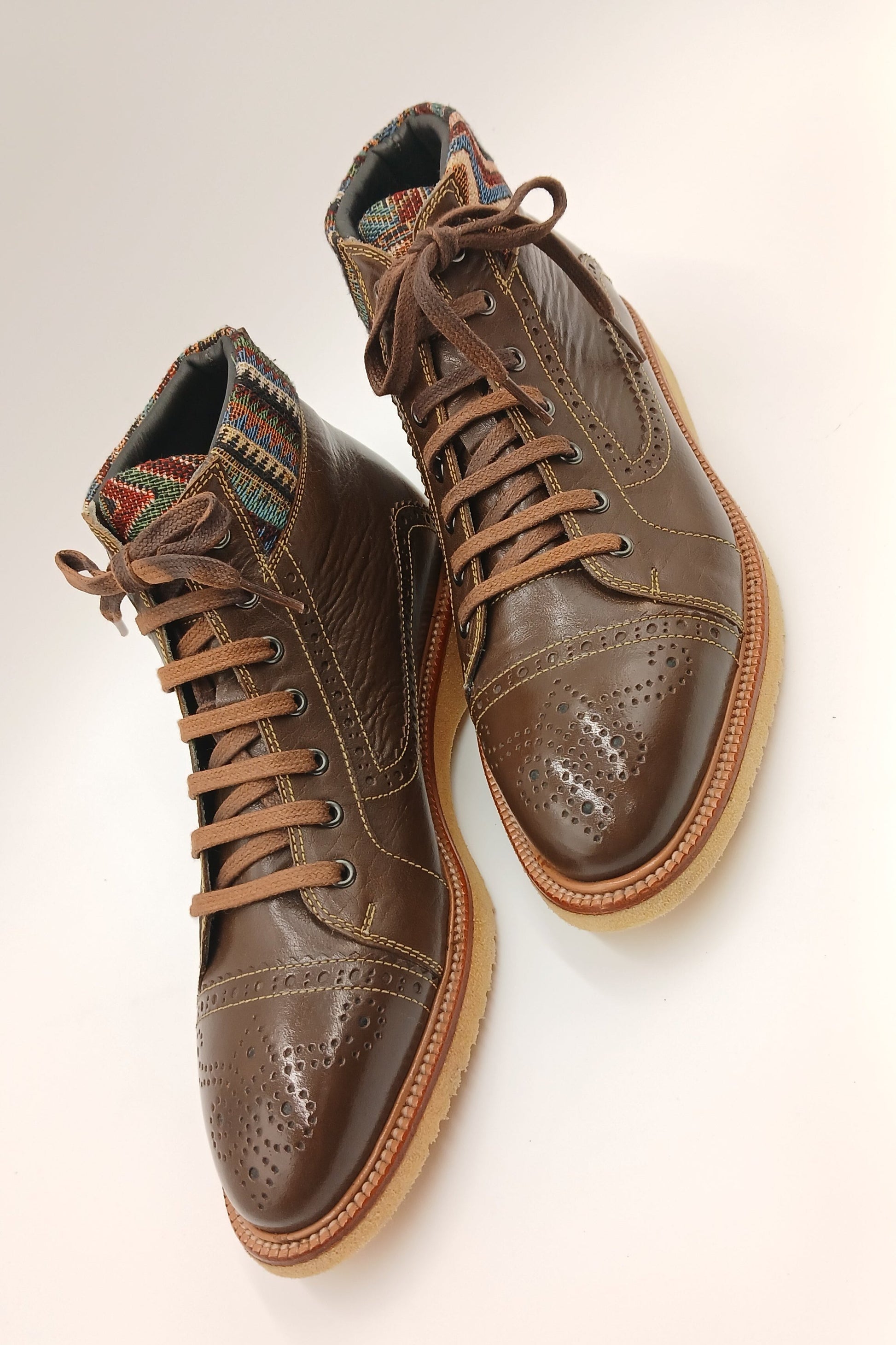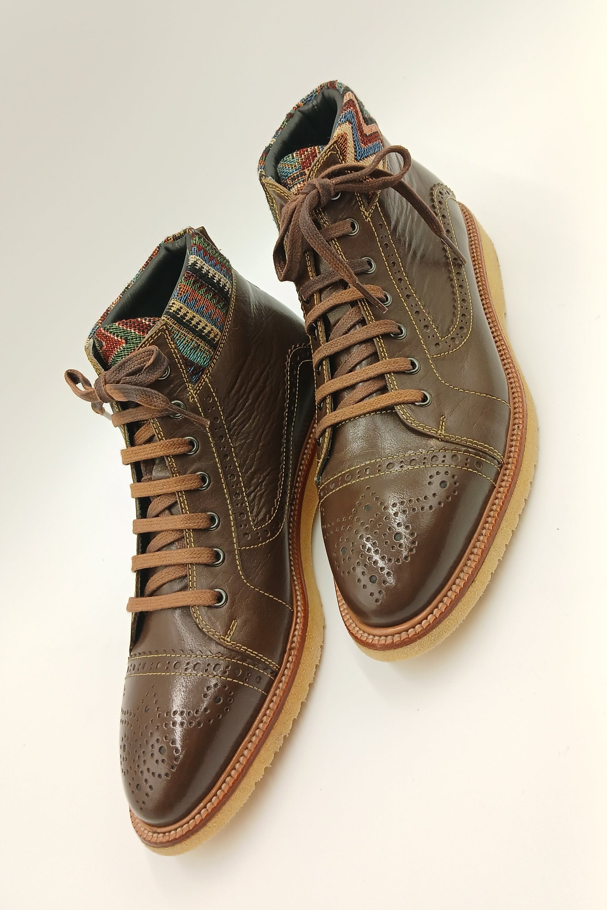 Step into a harmonious blend of craftsmanship and adventure with the Terra Nomad boots. Featuring premium full-grain cow leather accented with a vibrant woven collar, these boots are the perfect marriage of traditional brogue detailing and modern high-top design. The versatile structure offers both durability and comfort, making them ideal for urban exploration or casual outdoor adventures.