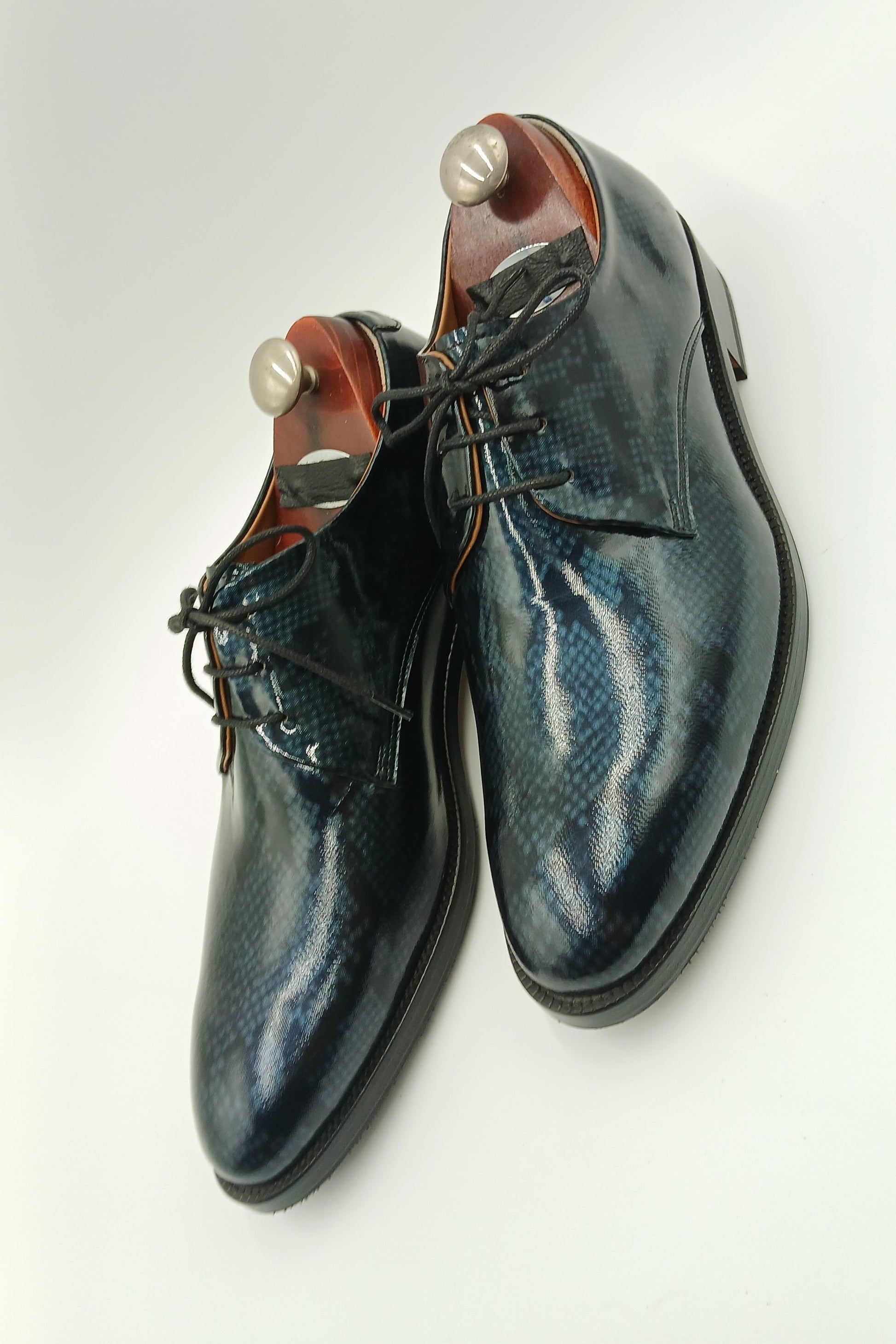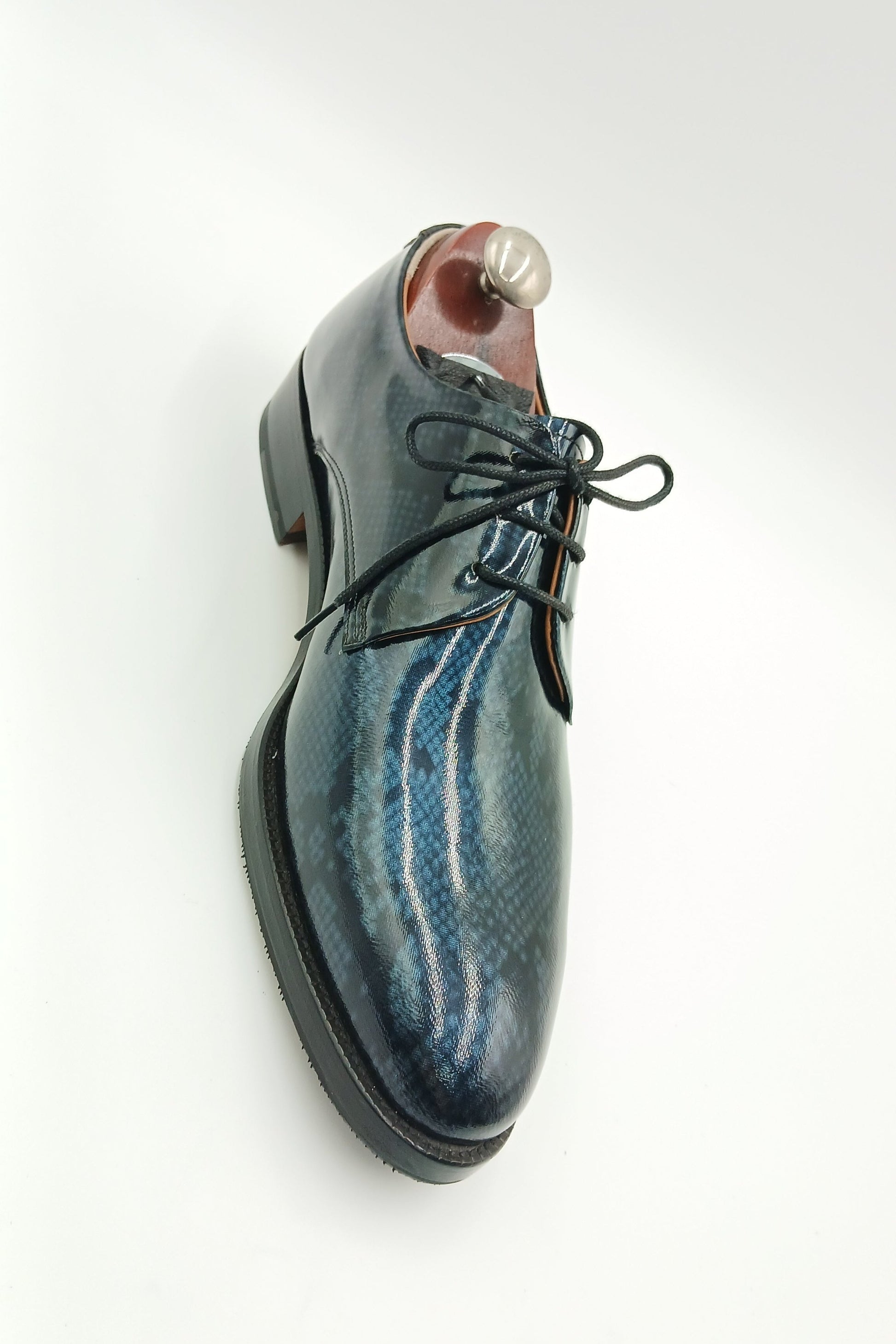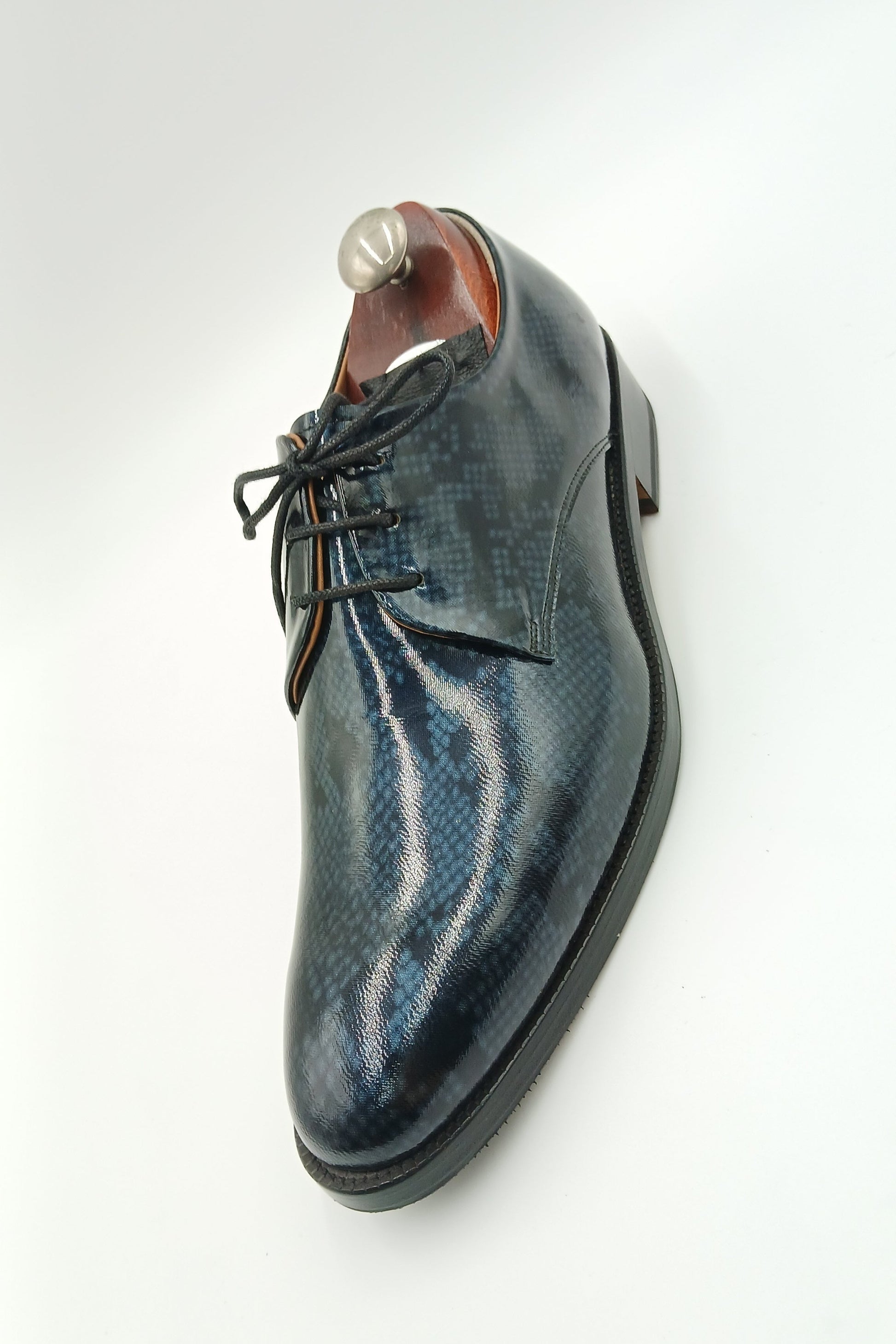 o   Upper: High-shine patent leather in a deep navy hue, featuring an embossed, snakeskin-like texture that mimics the shimmering surface of water under moonlight.