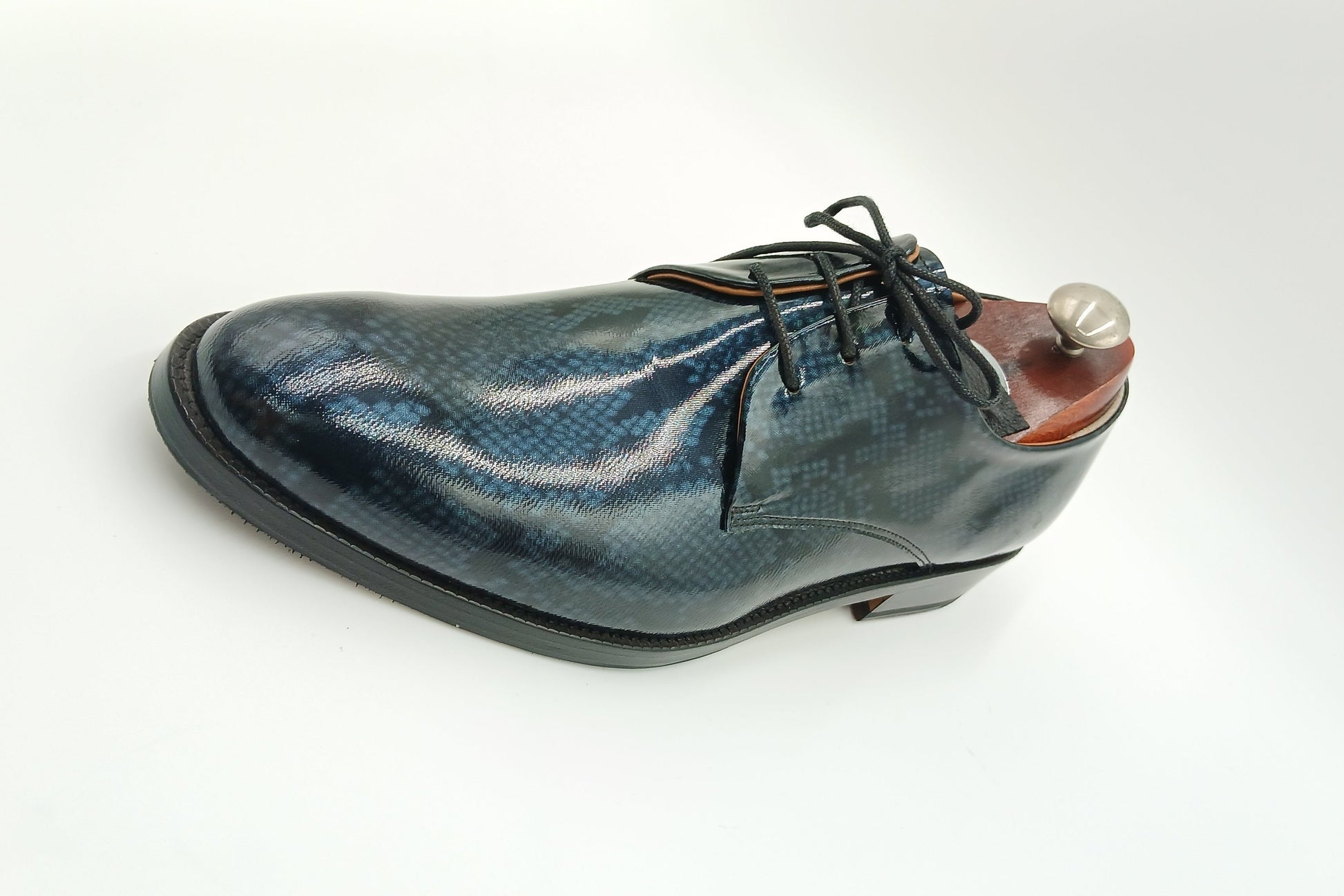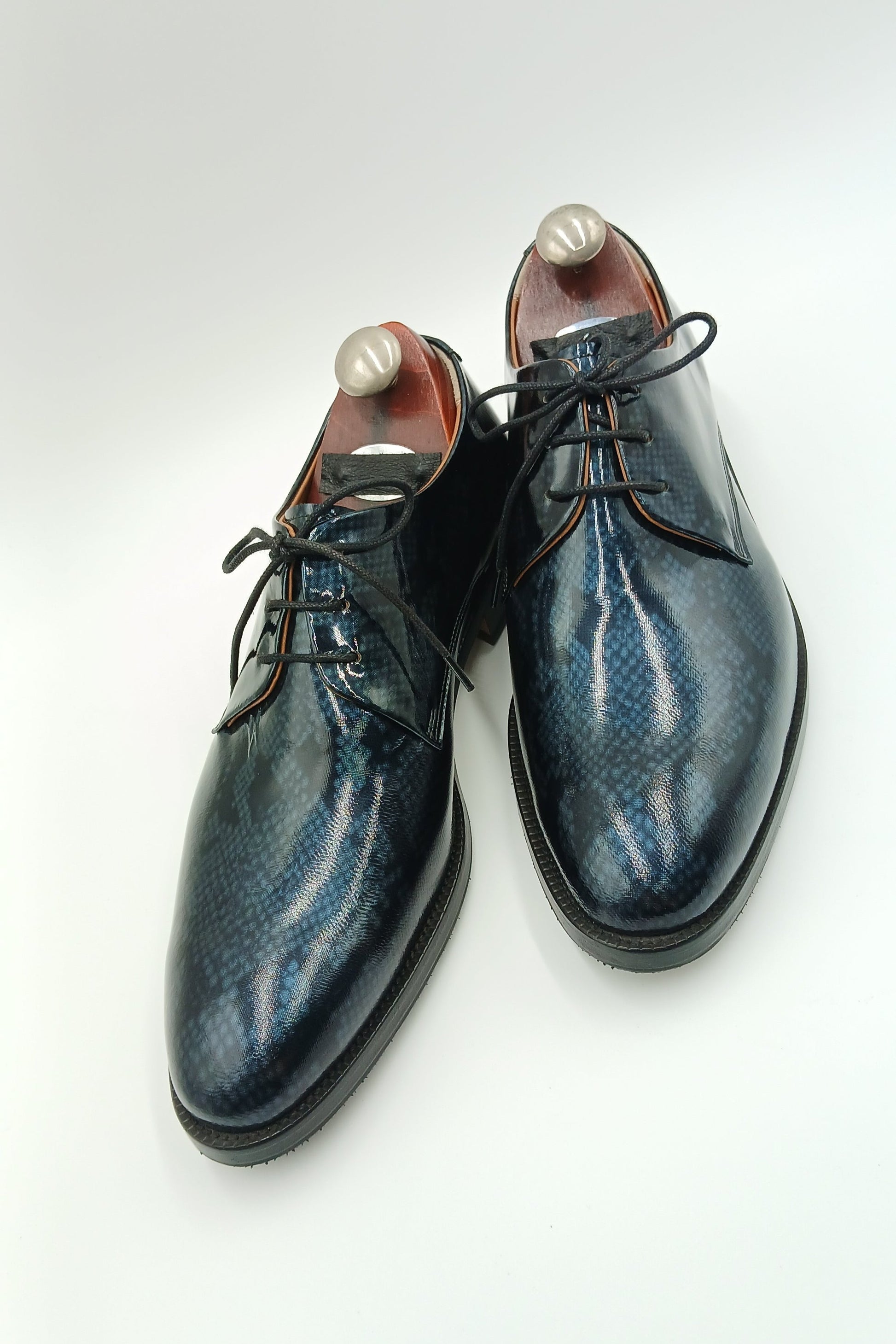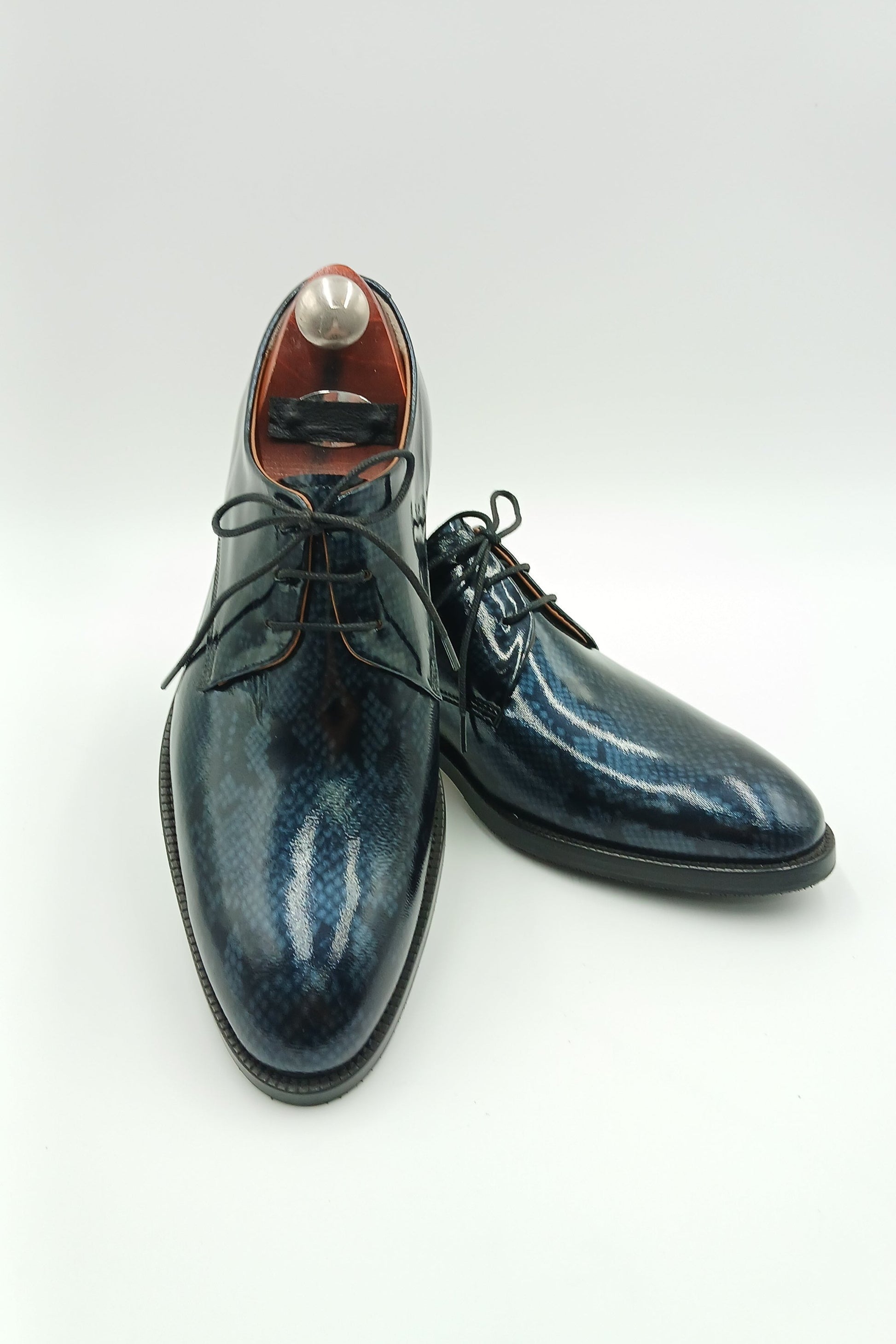 o   Upper: High-shine patent leather in a deep navy hue, featuring an embossed, snakeskin-like texture that mimics the shimmering surface of water under moonlight.