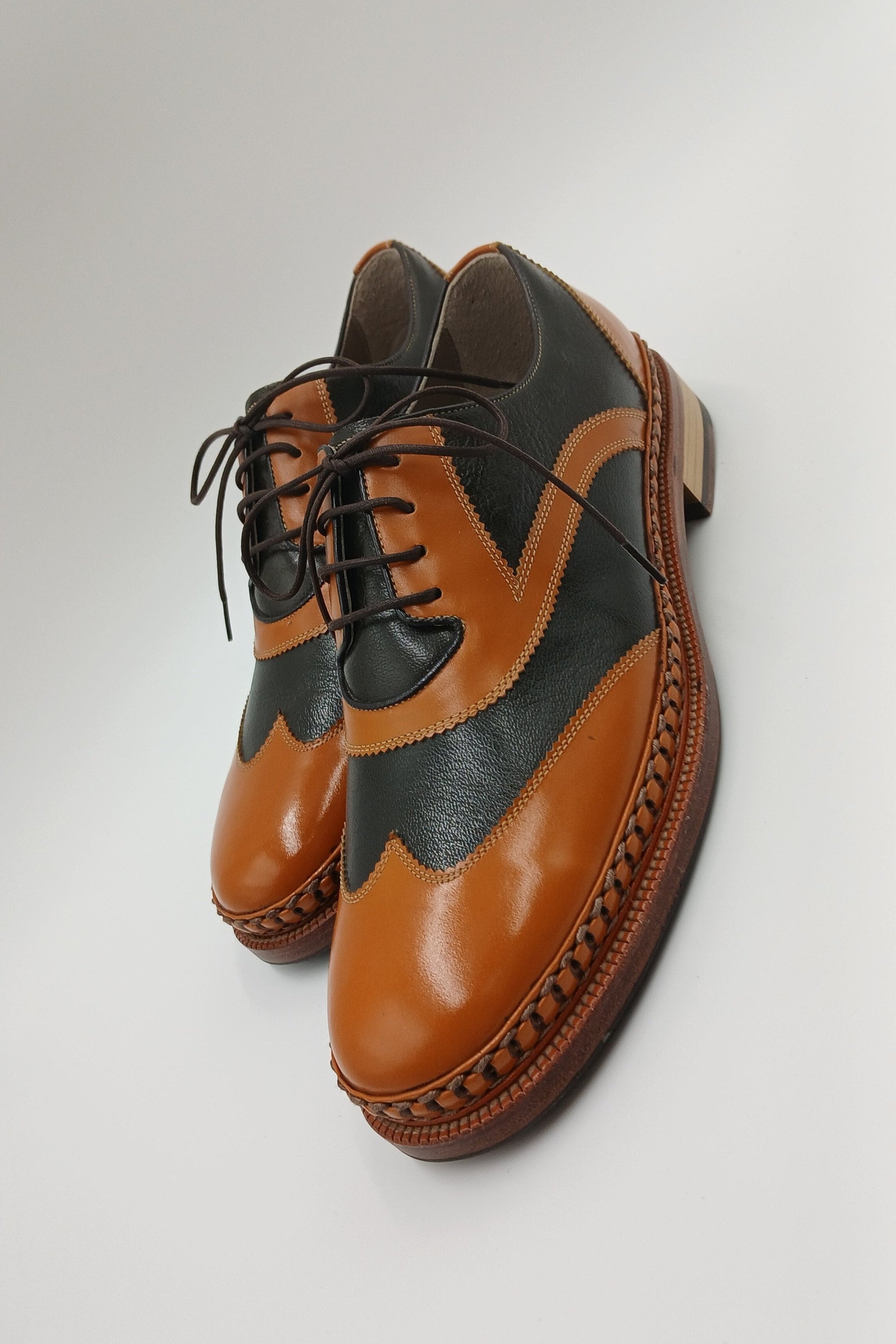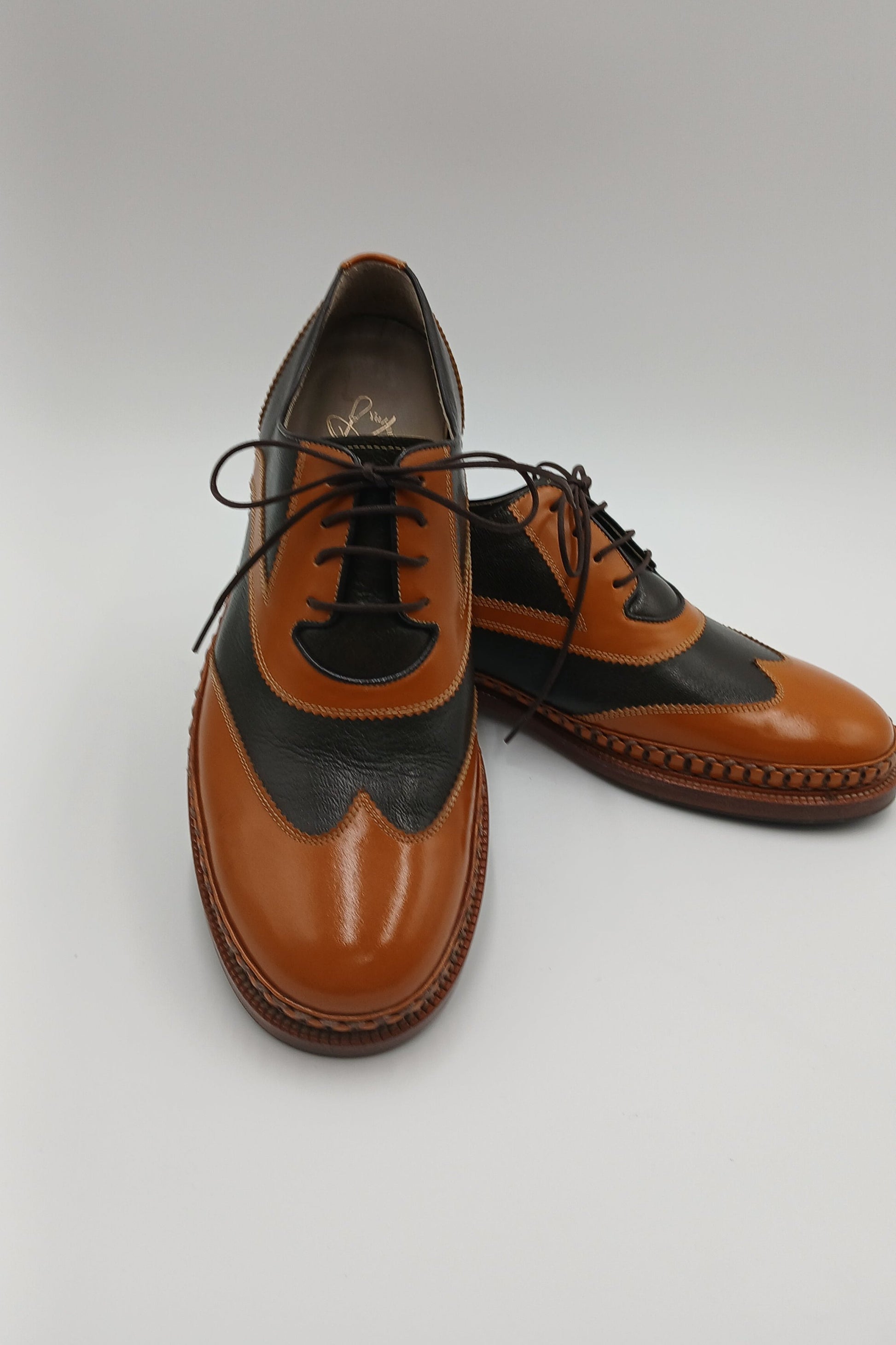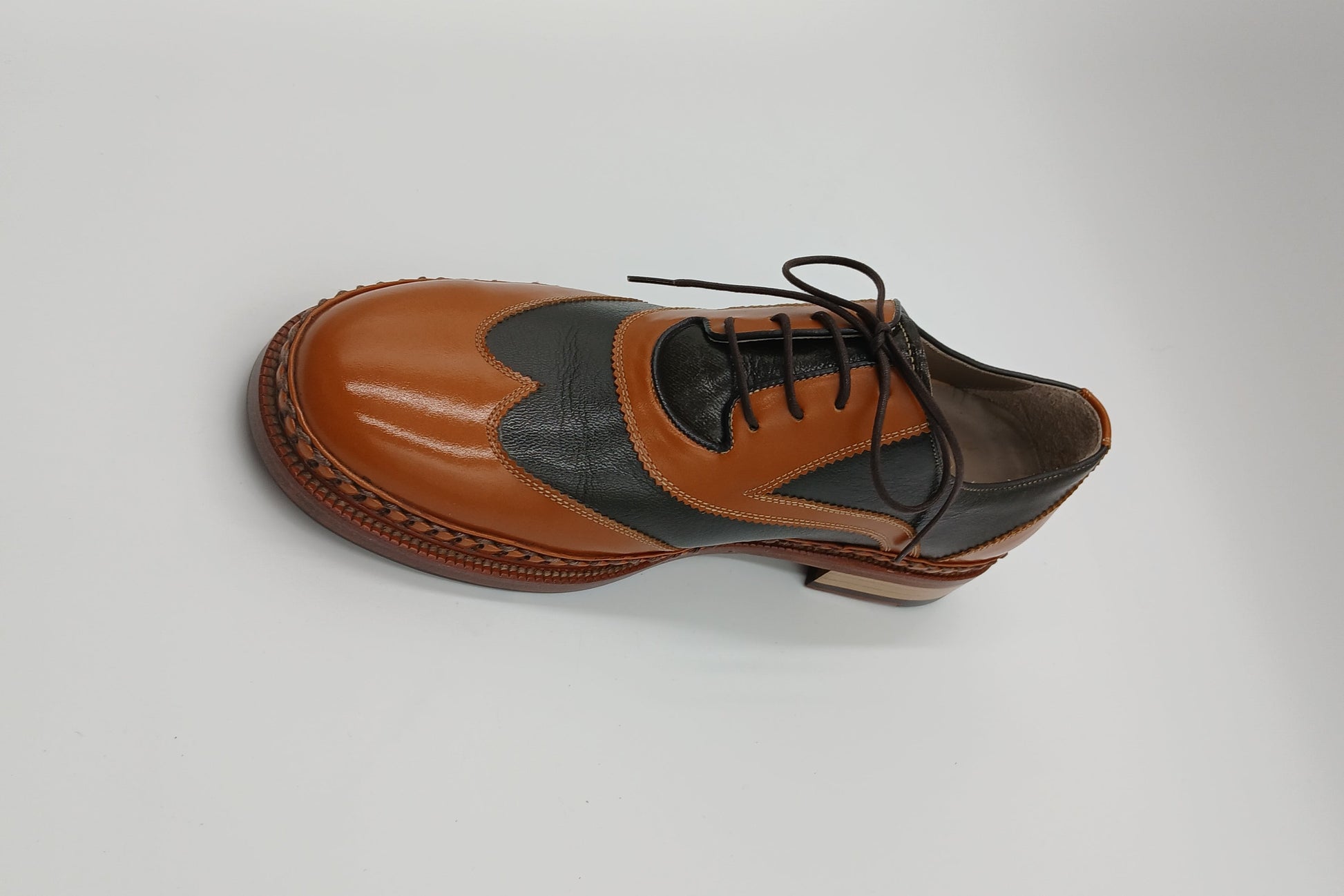 l Dual-Tone Upper: Contrasting panels of caramel brown and black leather create a bold yet elegant look.