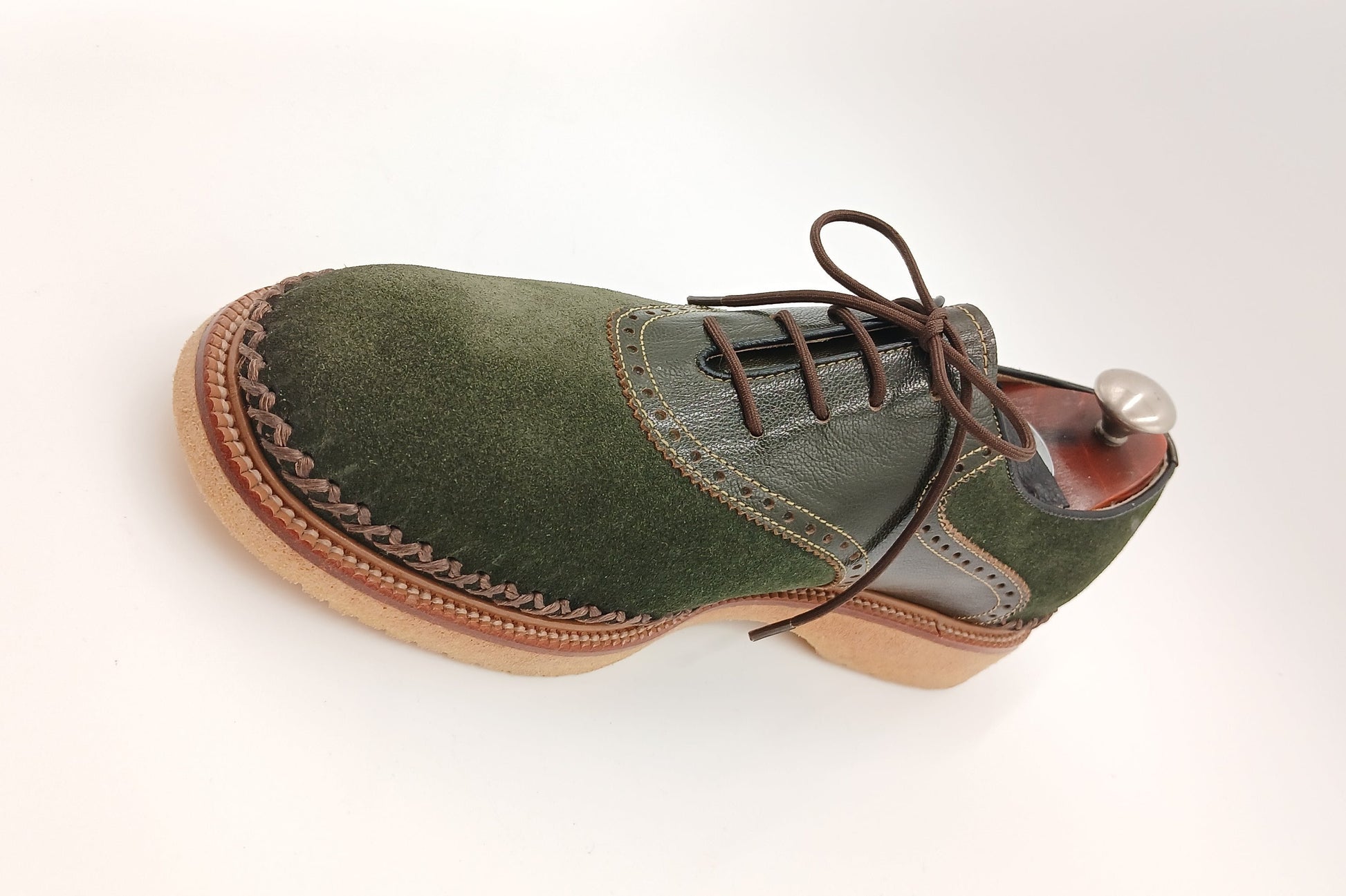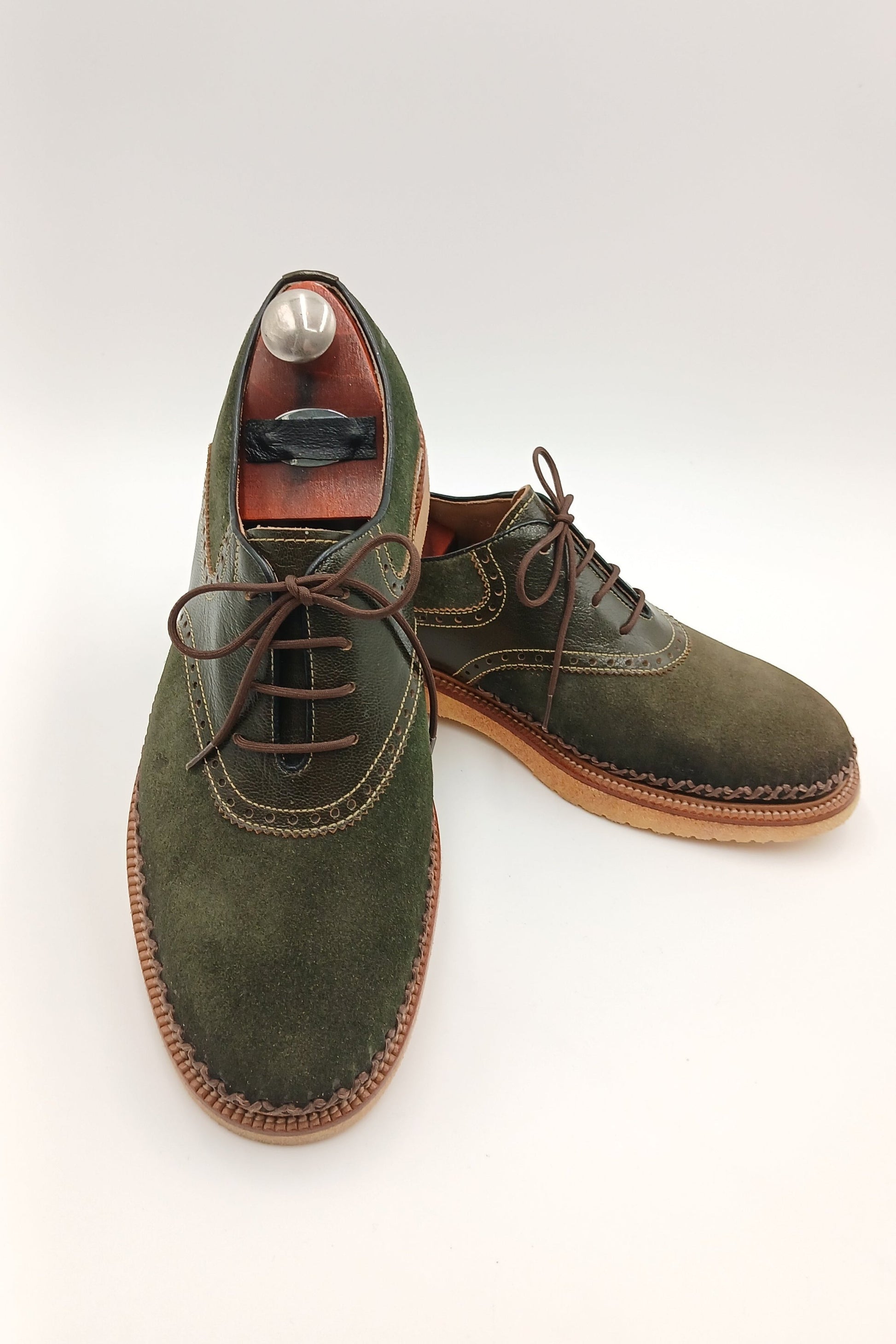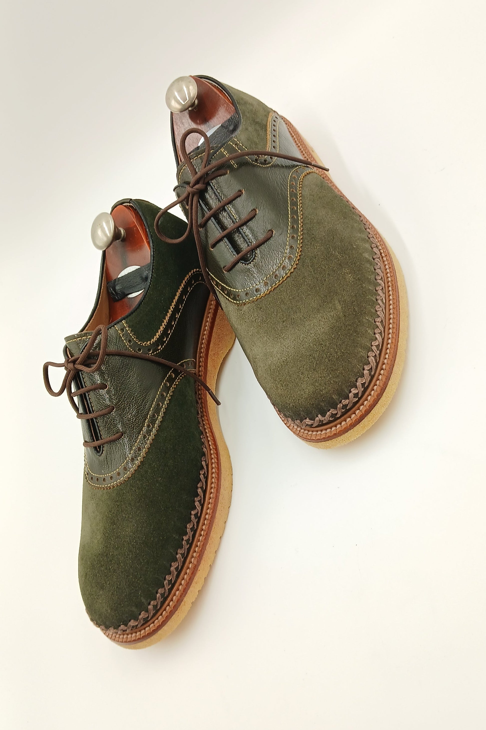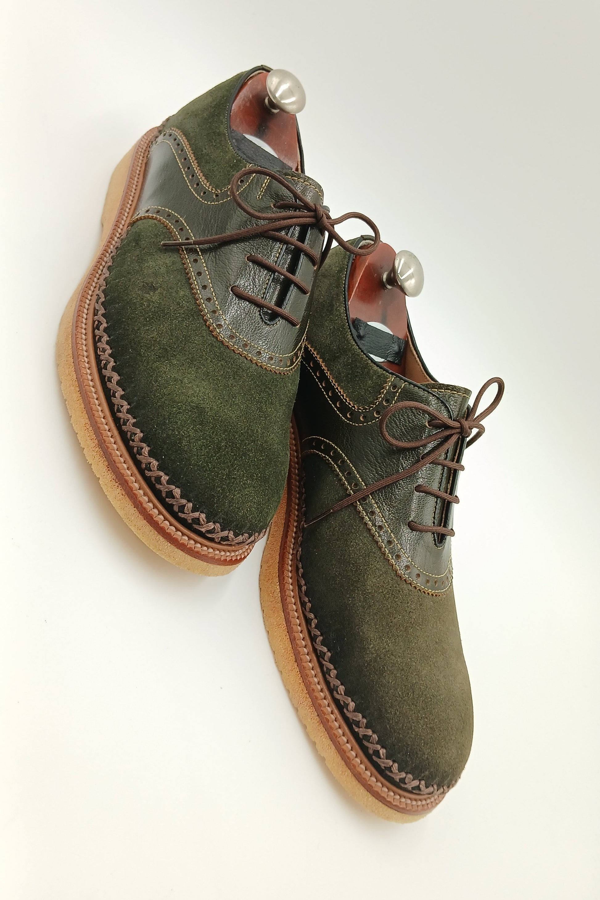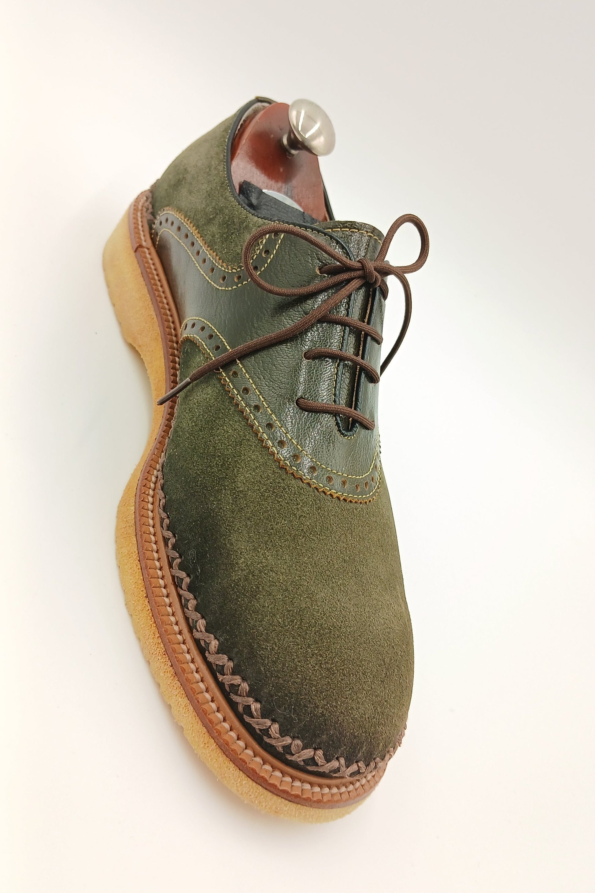 The Heritage Forest Derby is a harmonious blend of tradition and modernity, crafted with the finest green suede and premium leather. Designed for the discerning individual, this shoe marries rugged elegance with unparalleled comfort, making it a versatile addition to any wardrobe. Its hand-welted construction ensures durability, while the gum sole provides a comfortable grip, perfect for both formal occasions and casual outings. The detailed contrast stitching adds a layer of sophistication, highlighting the meticulous craftsmanship behind each pair.